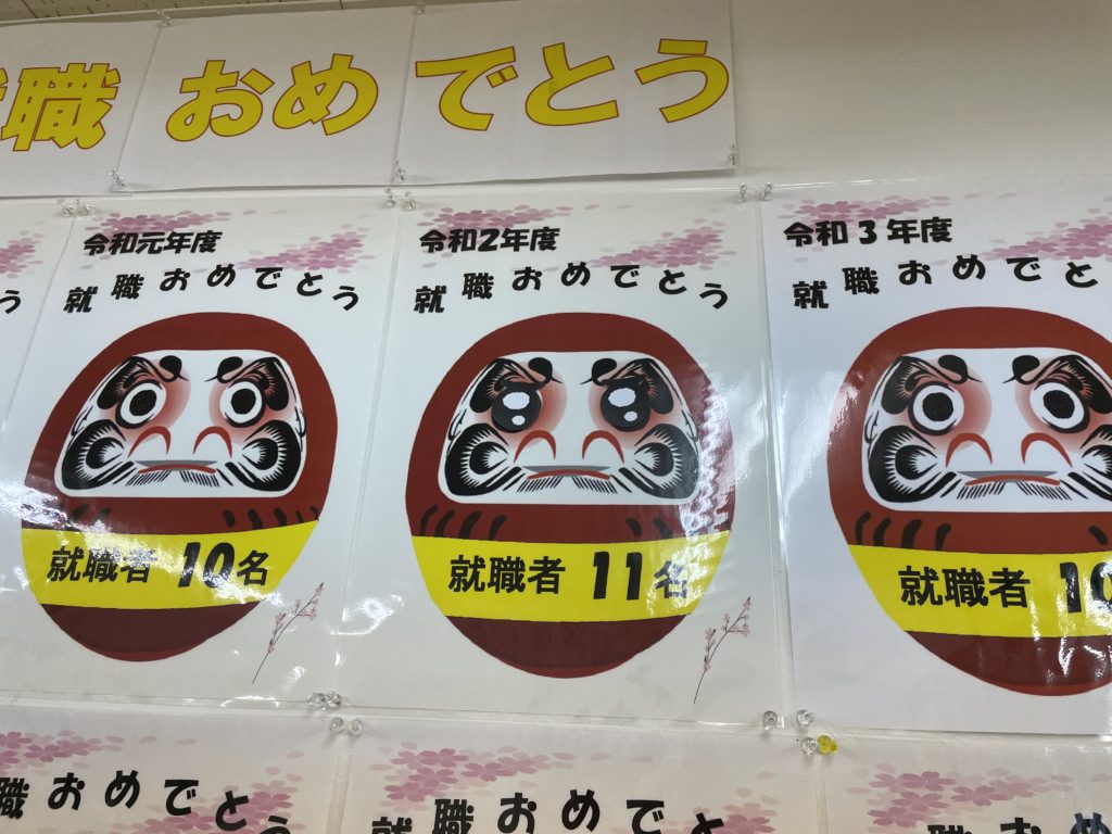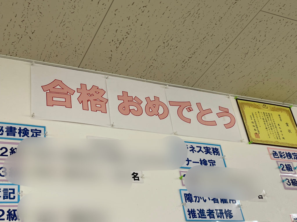 資格合格者一覧の上に貼ってある「合格おめでとう」の文字が