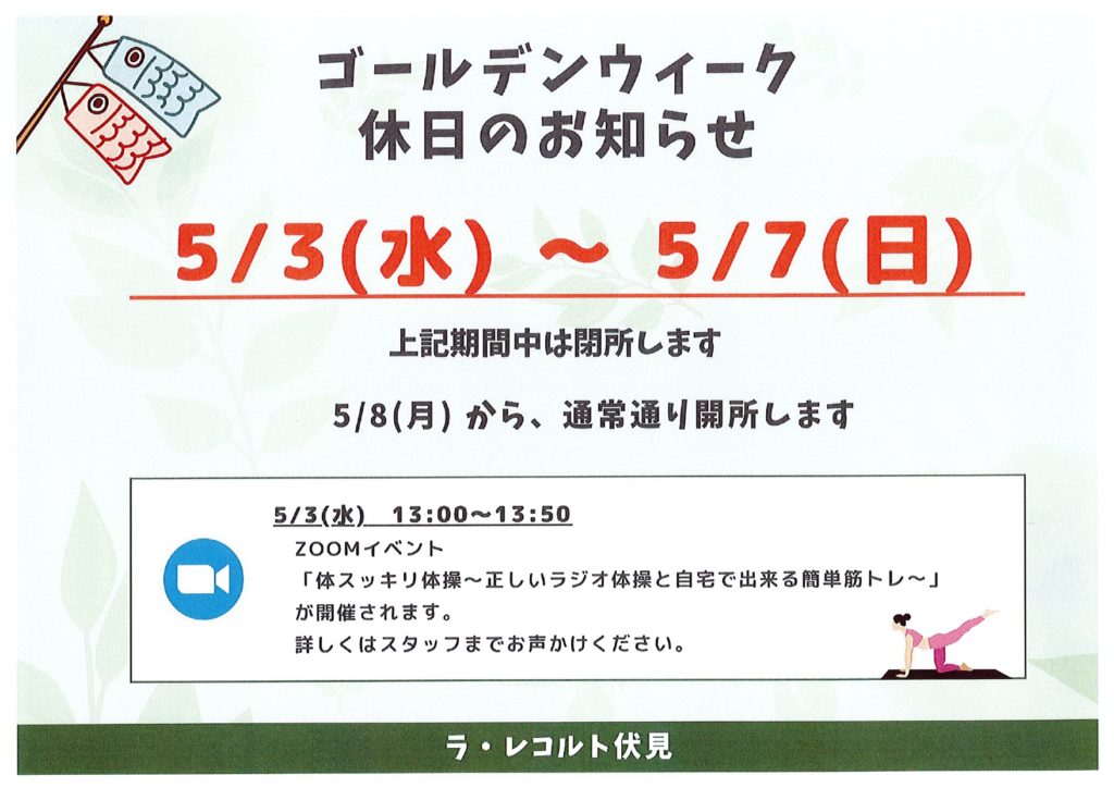 上記の画像の通り、5/3~5/7までお休みをいただきますのでご了承ください。