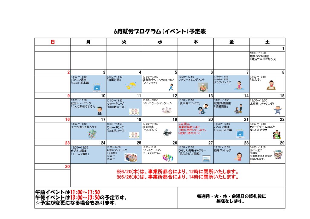 6月の就労プログラムが完成しましたのでご案内させていただきます。
