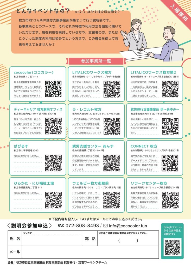 8/29(金)「就労支援合同説明会 in枚方」に参加します!