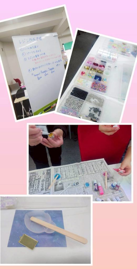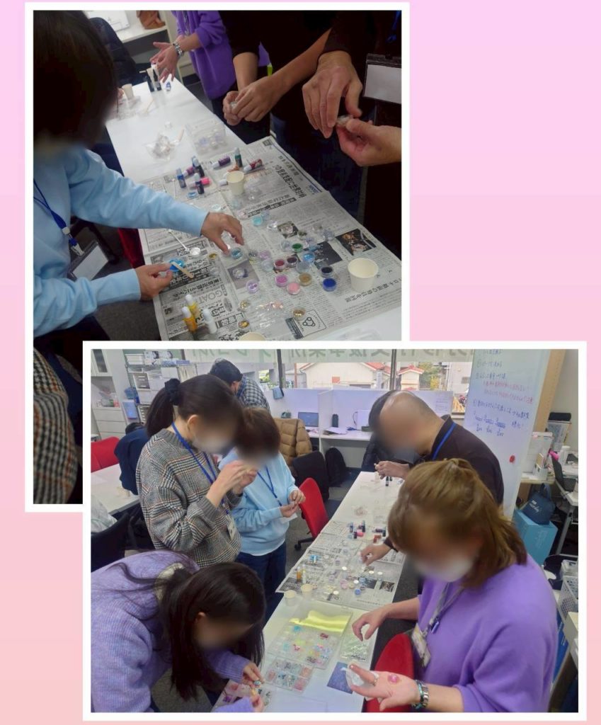 皆さん思い思いのキラキラパーツを選んで、レジンの色付けも挑戦しました🎨